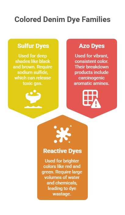 Blue denim uses indigo, a well-documented dye with known problems. Colored denim uses different dye systems entirely: sulfur dyes, reactive dyes, and in some cases azo compounds. Each brings its own chemistry, its own wastewater profile, and its own risks for workers and local environments.